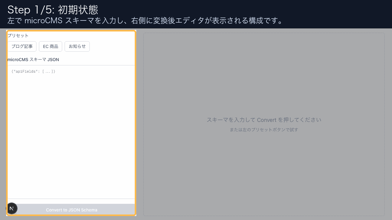 microCMS の独自スキーマ形式を JSON Schema (draft-07) に変換します。ゼロランタイム依存で、以下の 2 つの API を提供しています。